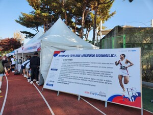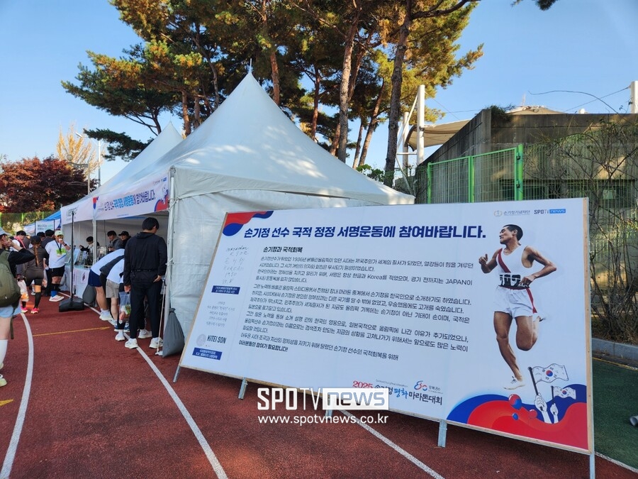 16일 경기도 고양특례시의 고양종합운동장에서 열린 2025 손기정 평화마라톤은 이런 문제의식을 참가자들에게 심어준 대회다. 손기정 기념재단에서 보조경기장 한쪽에 IOC에 국적과 이름을 회복하기 위한 서명 운동 자리를 마련했다.