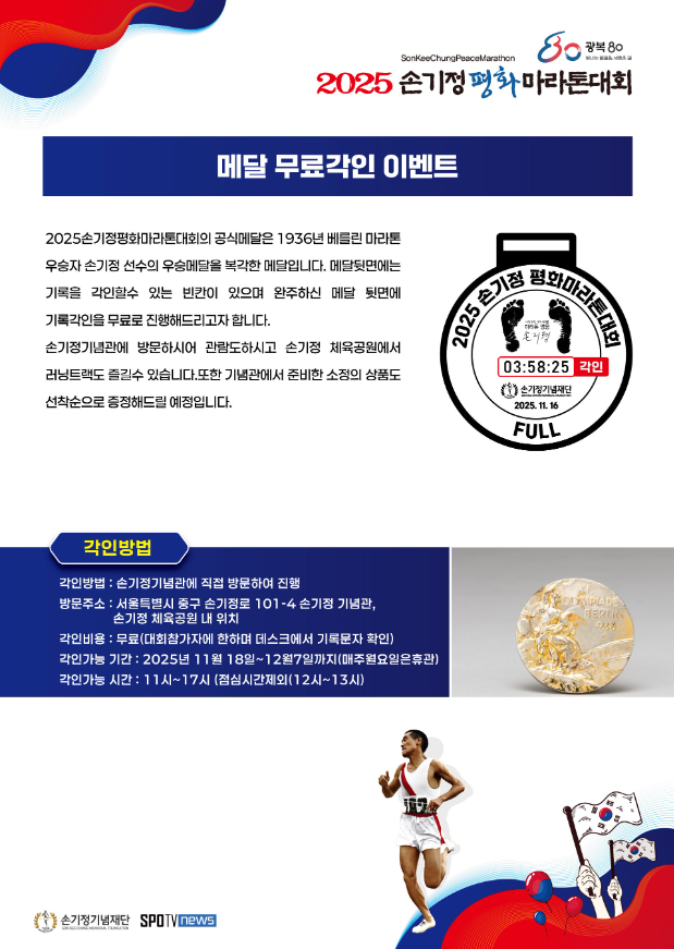 메달 뒷면에 대회 참가 공식 기록을 새기는 것은 물론 기념관 관람과 내의 트랙을 돌면서 자신의 달리기 실력을 다시 확인하는 '일석삼조'의 효과를 누릴 수 있다. 한국 육상 마라톤사의 시작이었던 손기정 선생을 통해 자유와 평화를 누리며 달릴 수 있는 것에 대한 숭고함, 감사함을 느낄 기회다.