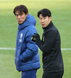 [스포티비뉴스=서울월드컵경기장, 곽혜미 기자] 축구대표팀 공식 훈련이 17일 오후 서울월드컵경기장에서 열렸다. 홍명보 감독, 손흥민이 훈련 전 대화를 나누고 있다.