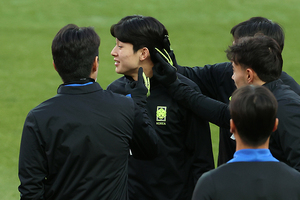 [스포티비뉴스=서울월드컵경기장, 곽혜미 기자] 축구대표팀 공식 훈련이 17일 오후 서울월드컵경기장에서 열렸다. 양민혁이 벌칙을 받고 있다.