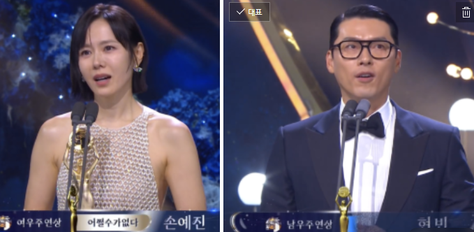 이어진 여우주연상 수상자 호명 순간, 손예진의 이름이 나오자 믿기 힘들다는 표정의 손예진은 남편 현빈의 포옹에도 여전히 어리둥절한 표정을 지어 눈길을 끌었다.