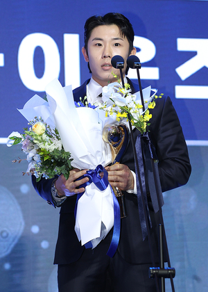 [스포티비뉴스=잠실, 곽혜미 기자] 2025 신한은행 SOL뱅크 KBO 시상식이 24일 오후 서울 송파구 잠실 롯데호텔 월드에서 열렸다. 우익수 부문 수비상을 수상한 삼성 김성윤이 소감을 말하고 있다.