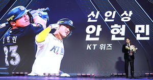 [스포티비뉴스=잠실, 곽혜미 기자] 2025 신한은행 SOL뱅크 KBO 시상식이 24일 오후 서울 송파구 잠실 롯데호텔 월드에서 열렸다. 신인상을 수상한 KT 안현민이 소감을 말하고 있다.