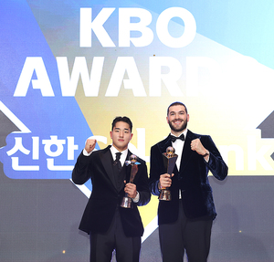 [스포티비뉴스=잠실, 곽혜미 기자] 2025 신한은행 SOL뱅크 KBO 시상식이 24일 오후 서울 송파구 잠실 롯데호텔 월드에서 열렸다. 신인상 안현민과 MVP 폰세가 기념 촬영을 하고 있다.