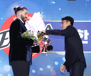 [스포티비뉴스=잠실, 곽혜미 기자] 2025 신한은행 SOL뱅크 KBO 시상식이 24일 오후 서울 송파구 잠실 롯데호텔 월드에서 열렸다. 평균자책점, 승리, 탈삼진, 승률상을 수상한 한화 외국인 투수 폰세가 손혁 단장으로부터 꽃다발을 받고 있다.